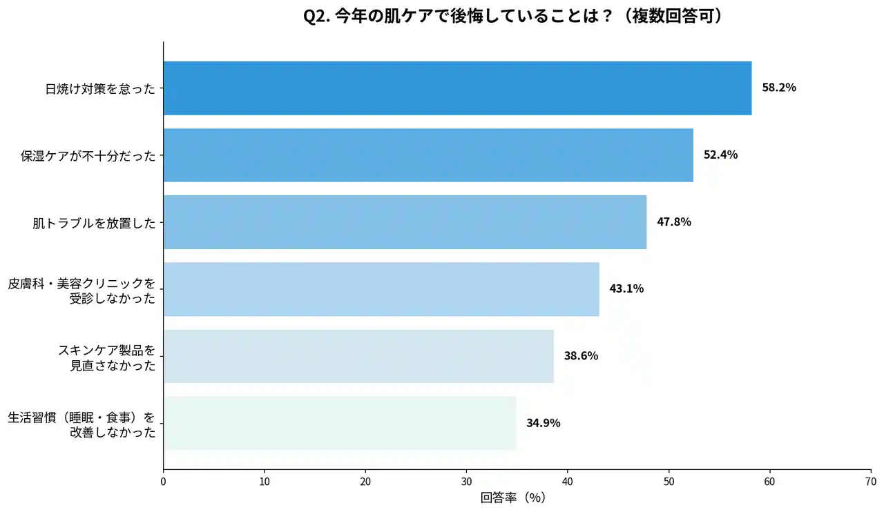 今年の肌ケアで後悔していることを調査したところ、最も多かったのは「日焼け対策を怠った」(58.2%)で、次いで「保湿ケアが不十分だった」(52.4%)、「肌トラブルを放置した」(47.8%)という結果になりました。 |