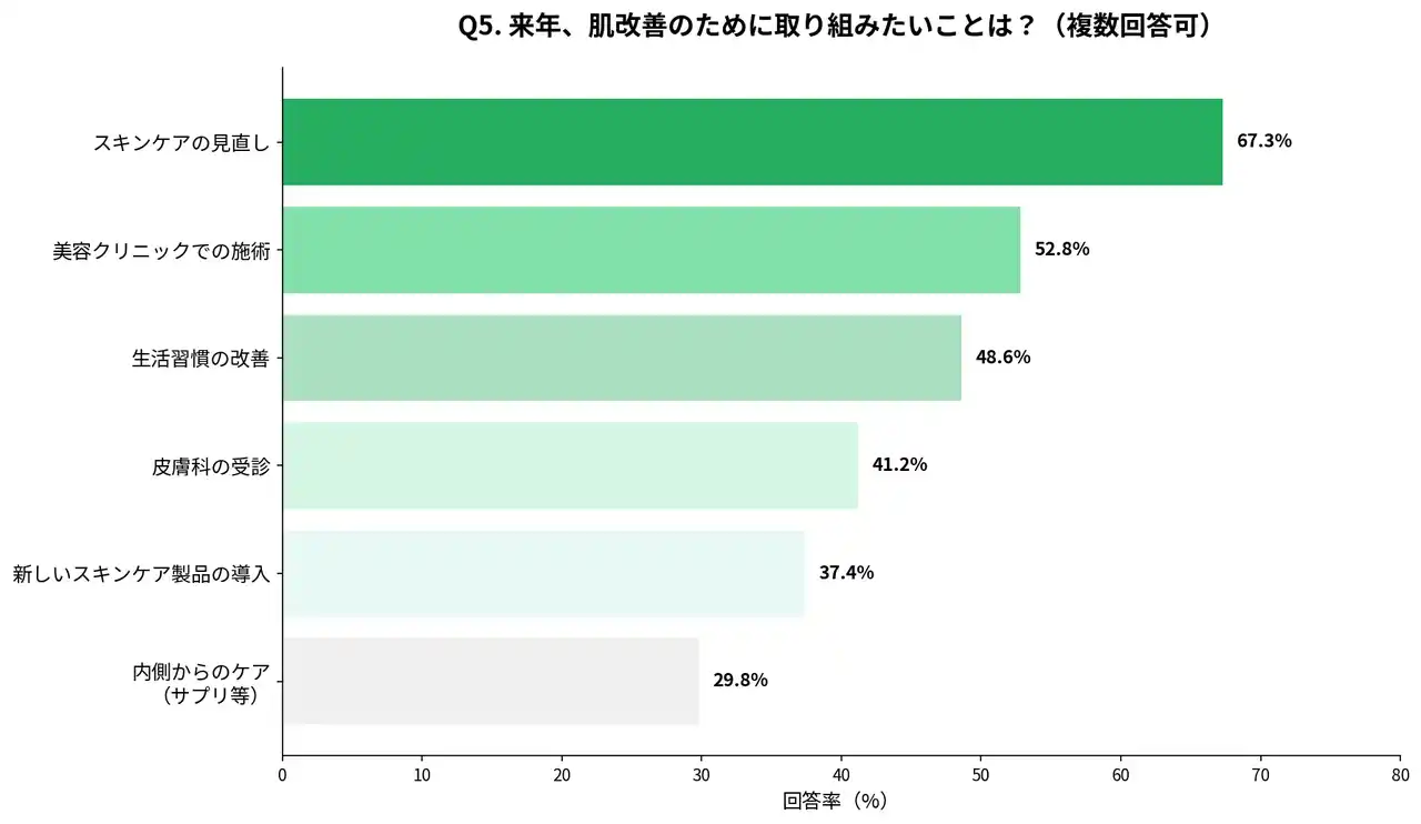 セルフケアだけでなく、専門的な施術への関心が高まっていることがわかります。Q2で「皮膚科・美容クリニックを受診しなかった」と後悔している方が多かったことを踏まえると、来年は行動に移したいという強い意欲が感じられます。 |
