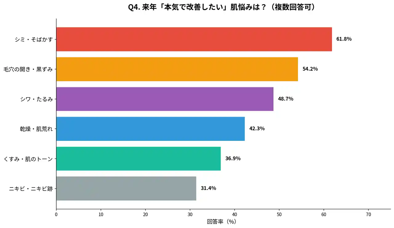 Q3で「今年一番気になった肌悩み」として挙げられた項目が、来年の改善意欲においてもそのまま上位にランクイン。今年解決できなかった悩みを「来年こそは」という強い意志で改善したいという心理がうかがえます。 |
