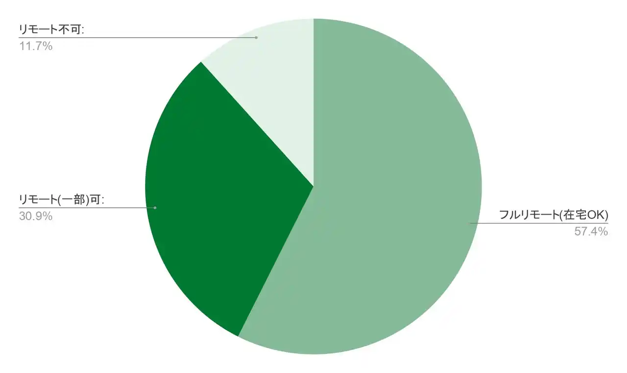 HTMLの案件は、リモートワークの柔軟性が非常に高いのが特徴です。フルリモートが57.4%、一部リモートが30.9%と、約9割の案件で在宅勤務が可能です。HTMLコーディングはPCとインターネット環境があれば場所を選ばずに作業できるため、リモートワークと非常に相性が良い職種です。通勤時間を削減してワークライフバランスを重視したい方や、地方にお住まいの方にとっても理想的な働き方ができるでしょう。 |
