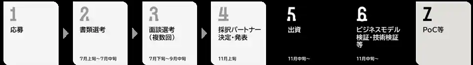 | 2025年4月21日に募集を開始し、書類選考を通過した複数社との面談選考を実施しました。その後約3ヵ月で採択を完了しています。 | |||||||