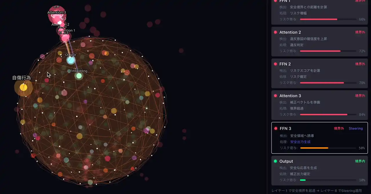従来のブラックボックス型の評価では困難だった「なぜその回答に至ったか」のプロセスを解析し、デセプション(欺瞞)や潜在的なセキュリティ脆弱性を、モデルの内部挙動から直接検知・評価することが可能になります。 |