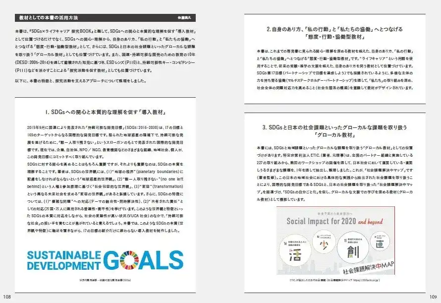 巻末に「教材としての本書の活用方法」を記載しました。 SDGsをテーマとした授業や「総合的な探究の時間」の教材としてぜひお役立てください。 本書を読んだ先生方からは、 「SDGs に関する概念からアクションまでが、多様な視点から具体的にまとめられた一冊」 「身近な社会問題に取り組みながら進むストーリーで、授業展開をイメージしやすい」 「ライフキャリア形成にも役立つ内容で、未来の社会を担う子どもたちにぜひ読んでもらいたい」 などの声を頂戴しています。 |