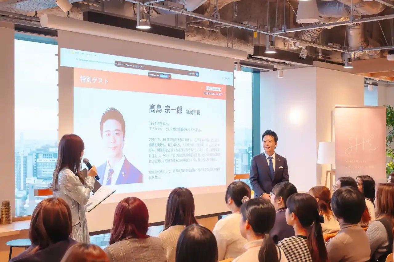 当日は会場・オンラインにて、会員・非会員を含む多くの方にご参加いただき、会場は満員となる約50名が参加。さらに、福岡市長・高島宗一郎氏を迎えたトークセッションをはじめ、九州で活躍するSHElikes受講生によるキャリアストーリーの共有など、地域における女性のキャリア形成の可能性を考える機会となりました。
