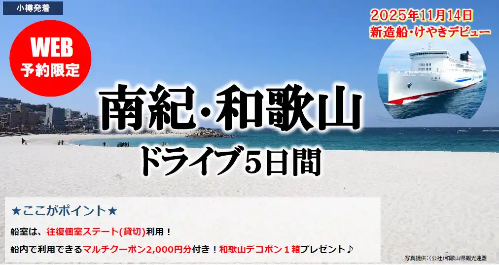 | ♦【プラン1】南紀・和歌山ドライブ<小樽港~舞鶴港限定> | ||||||||||||||||||||