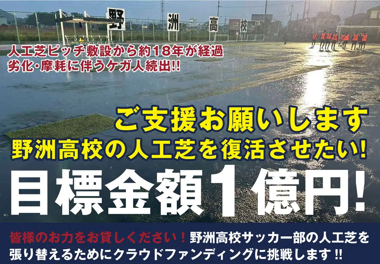 このプロジェクトは、人工芝ピッチの全面改修を行い、安心安全で快適な環境を取り戻すための挑戦です。 皆様のご支援が、未来のサッカー選手を育てます。どうぞよろしくお願いいたします。 【事業主体】 滋賀県立野洲高等学校 野洲高等学校PTA・後援会 |