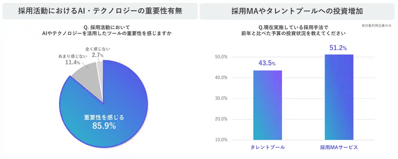 こうした背景のもと、採用を持続させるため、テクノロジーと仕組みに支えられる採用への変革が加速した一年でした。調査では、採用活動において「AIやテクノロジーの活用」が重要だと感じている担当者は85.9%にのぼりました。タレントプールの予算を「増加」と回答した企業は43.5%、採用MAサービスの予算を「増加」と回答した企業は51.2%と、候補者との継続的な関係構築を目的とした仕組みへの投資が進んでいます。AIやテクノロジーは、もはや一部の先進企業だけの最先端の選択肢ではなく、採用を持続させるための標準装備となりつつあります。 |