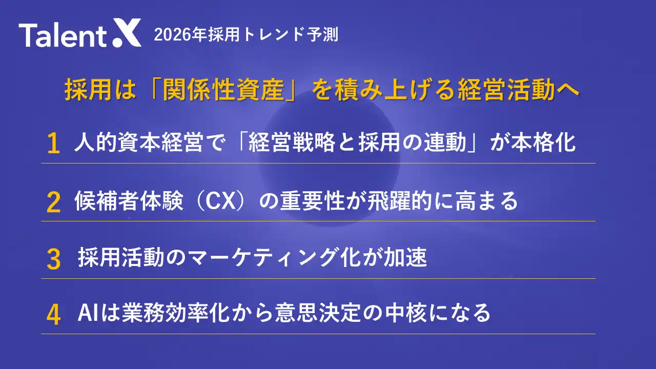 株式会社TalentX(本社:東京都新宿区、代表取締役社長CEO:鈴木 貴史、証券コード:330A、以下「当社」)は、日本の採用市場の2025年総括と、2026年採用トレンド予測を発表いたします。 |