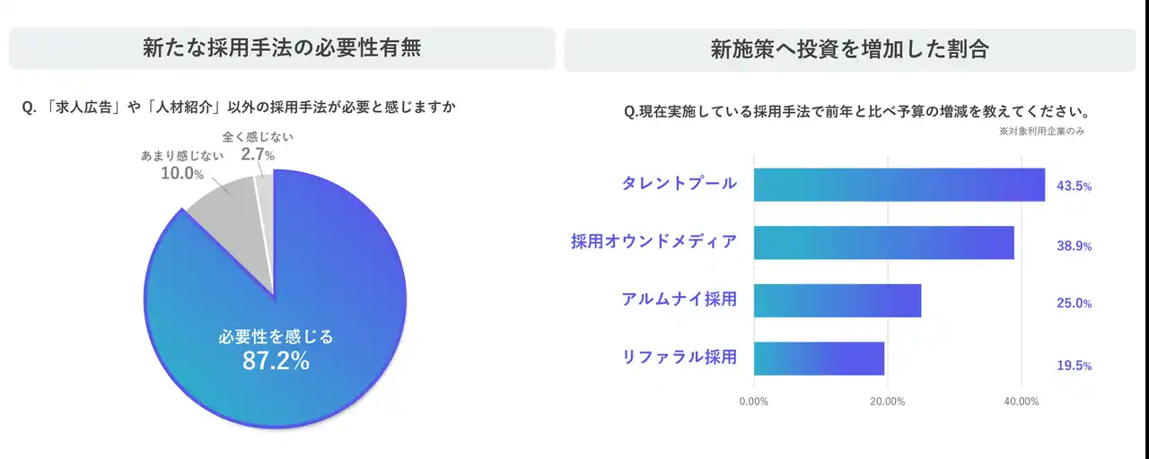 「求人広告・人材紹介以外の新たな採用手法が必要」と回答した企業は87.2%に達し、従来の採用手法による人材獲得の難易度は高まっています。その結果、リファラル採用(実施58.4%)、アルムナイ施策(実施42.0%)、過去応募者や辞退者へのアプローチを行うタレントプール施策(実施31.5%、検討含め63.0%)など、将来の候補者との関係性を前提とした取り組みが広がりを見せました。 |