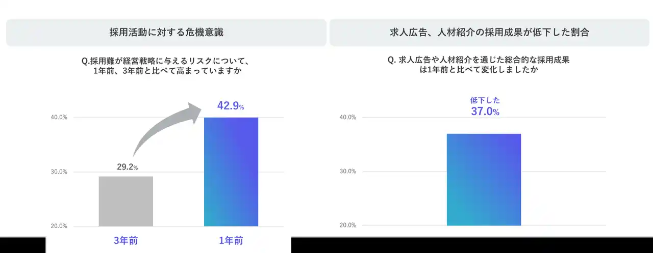 2025年の最も大きな変化は、採用難に対する危機感が経営と採用現場の共通認識として定着したことです。当社調査では採用難が経営戦略に与えるリスクについて、直近1年で「大幅に高まった」割合が42.9%を示しており、3年前から大きく上昇しました。また、求人広告や人材紹介を通じた採用成果は、直近1年で「低下した」と感じている企業が37.0%にのぼっています。リスクが高まっている一方、成果獲得が困難になっている実態が明らかになりました。 |