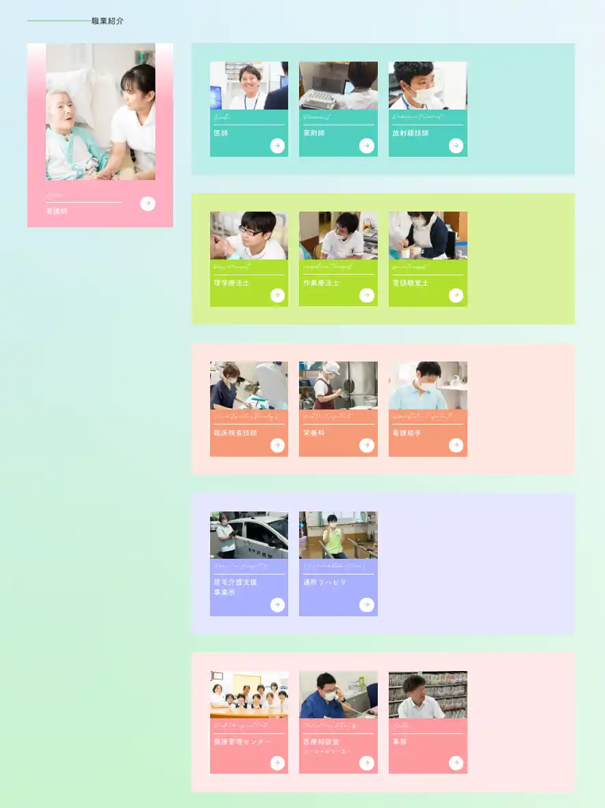「看護師」「リハビリ職」「介護職」など、職種ごとに独立した採用ページを新設しました。 それぞれのページで、業務内容や所属長のメッセージ、実際に働くスタッフの声(インタビュー)など、その職種特有の知りたい情報を集約。 一般的な病院全体の紹介にとどまらず、求職者が「自分の専門職としての働き方」を深く理解できるようにし、入職後のギャップを解消する設計としました。 |