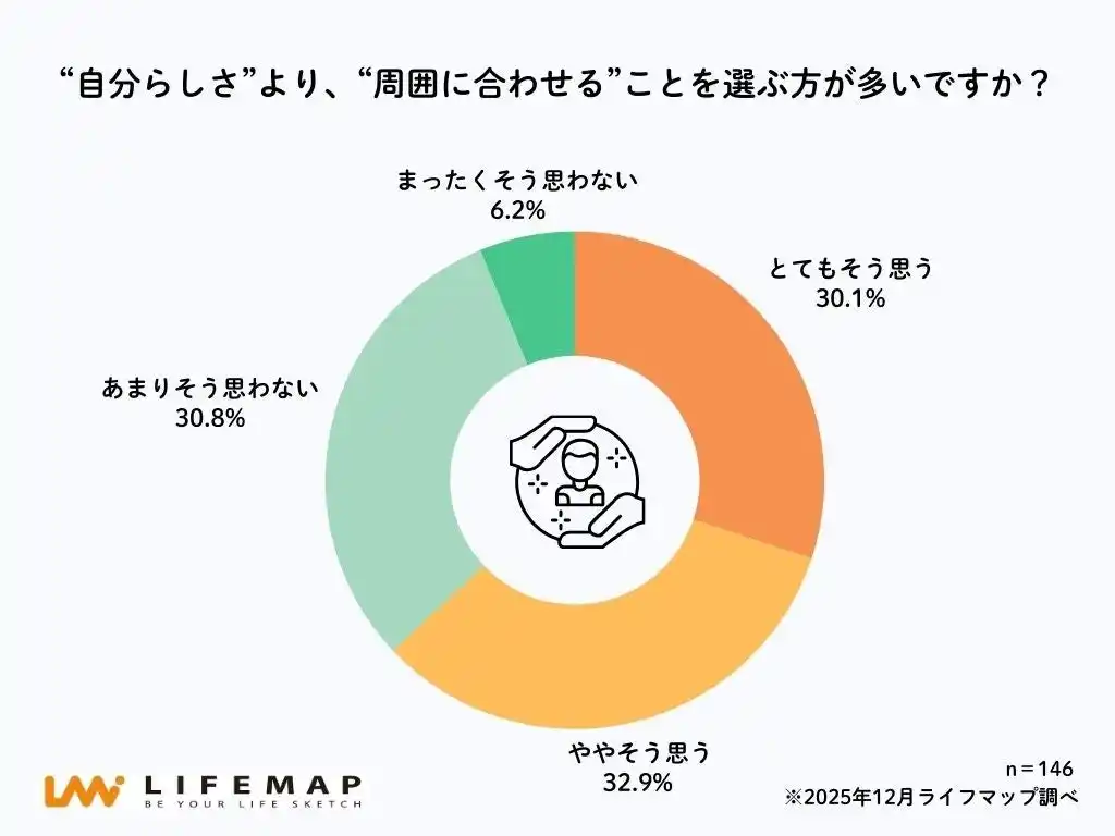 | 「“自分らしさ”より、“周囲に合わせる”ことを選ぶ方が多いですか?」という問いに対し、63.0%の高校生が「とてもそう思う」「ややそう思う」と回答しました。内訳は、「とてもそう思う」が30.1%、「ややそう思う」が32.9%となっており、自分らしさよりも周囲との関係性を優先する場面が少なくないことがうかがえます。 | ||||||||