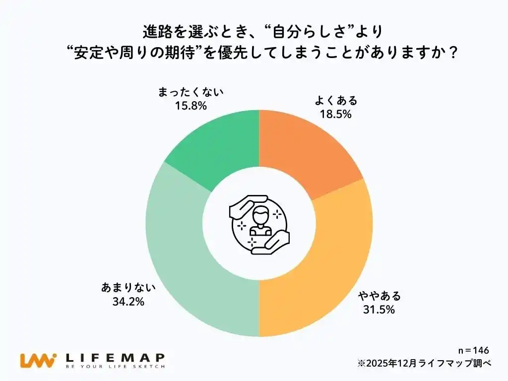 | 「進路を選ぶとき、“自分らしさ”より“安定や周囲の期待”を優先してしまうことがありますか?」という問いに対し、50.0%の高校生が「よくある」「ややある」と回答しました。内訳は、「よくある」が18.5%、「ややある」が31.5%となっています。 | ||||||||