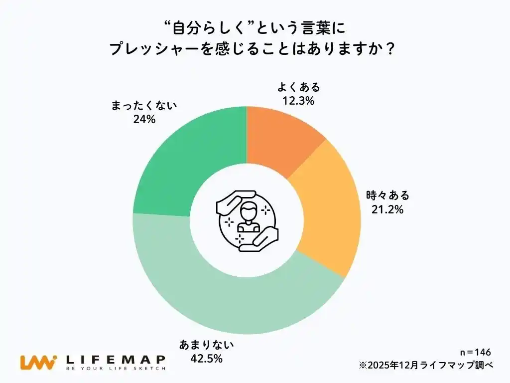 | 「“自分らしく”という言葉にプレッシャーを感じることはありますか?」という問いに対し、33.5%の高校生が「よくある」「時々ある」と回答しました。内訳は、「よくある」が12.3%、「時々ある」が21.2%となっています。一方で、「あまりない」は42.5%、「まったくない」は24.0%となり、全体ではプレッシャーを感じていない層が多数を占める結果となりました。その一方で、約3人に1人がこの言葉に対して負担を感じていることも明らかになっています。 | ||||||||