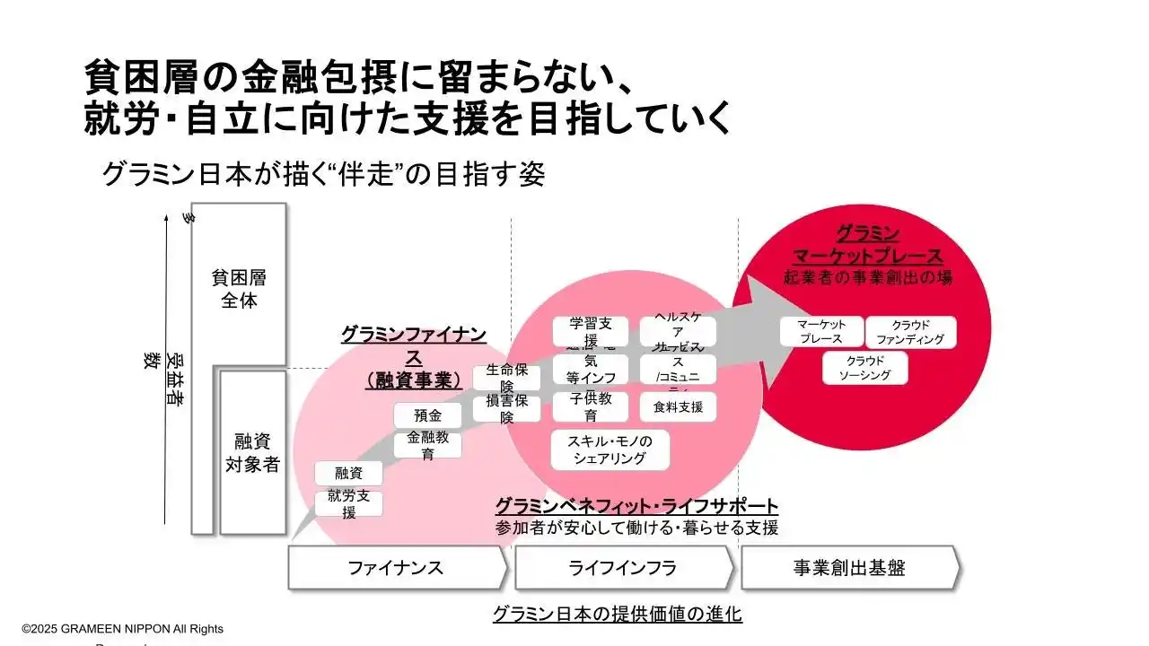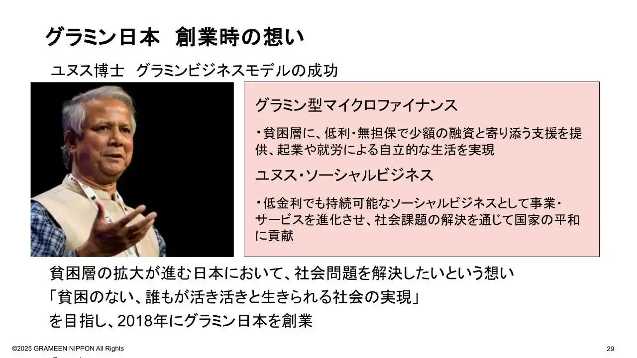 | ムハマド・ユヌス博士により、バングラデシュに設立されたマイクロファイナンス機関「グラミン銀行」の日本版として2018年に設立。グラミン銀行は、生活困窮層の自立を支援した功績により2006年にノーベル平和賞を受賞しました。「誰もが活き活きと社会で活躍する持続可能な社会」の実現をビジョンに掲げ、主に生活困窮の状態にある女性に対して、生活資金ではなく「起業や就労の準備資金」を融資するマイクロファイナンスと、多様なパートナーとの共創によって生まれる「一歩を踏み出す機会」を提供することをミッションとしています。私達は、チャンスを願い、一歩を踏み出そうと想う人々の伴走者として、共に歩み続けます。 | |||