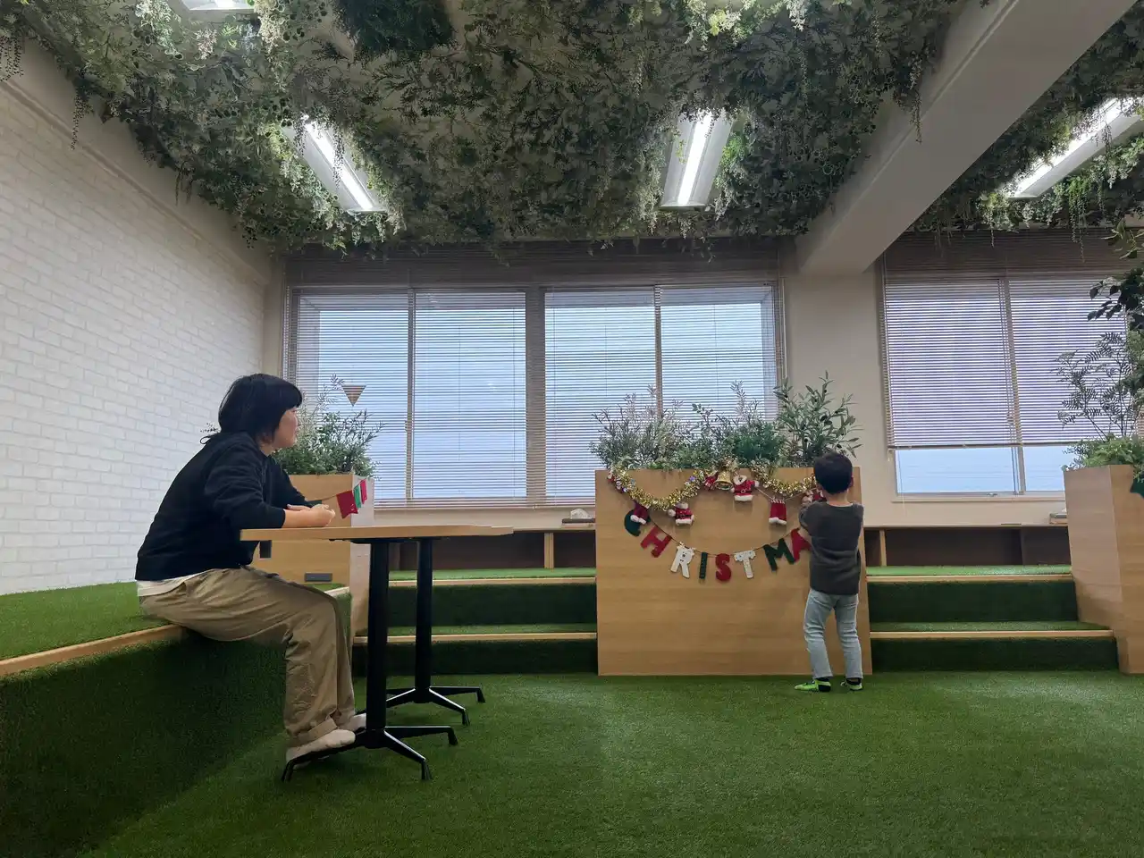 制作後は本社4Fの芝生スペースがあるカフェテリアへ。おやつを楽しみながらスタッフと交流し、アットホームな時間となりました。 |