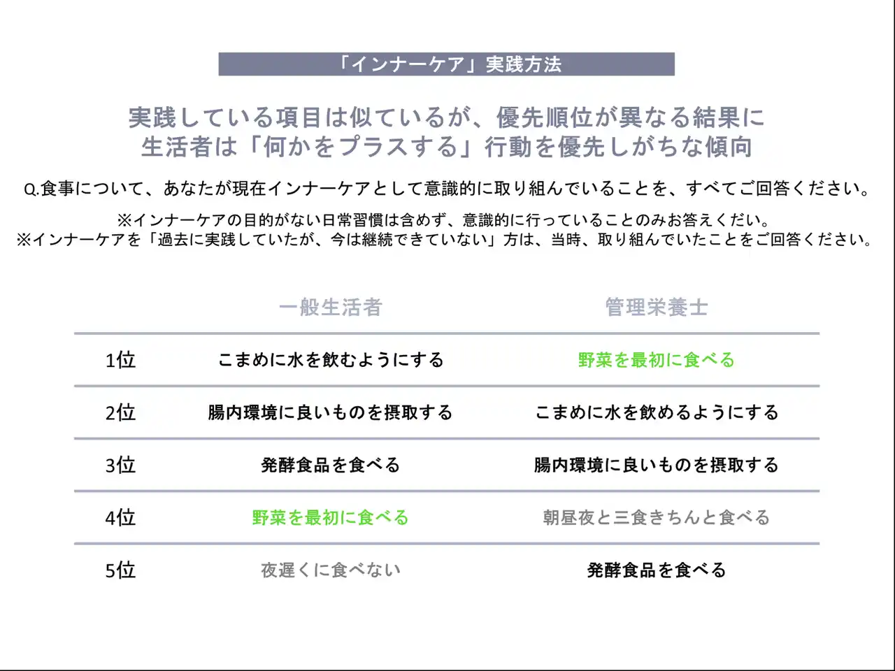 インナーケアとして実践している内容の上位5つには、「こまめな水分補給」「腸内環境に良いものを摂取」「発酵食品を食べる」「野菜を最初に食べる」など、両者で共通点が多くみられる一方で、その順位には違いが見られました。 |