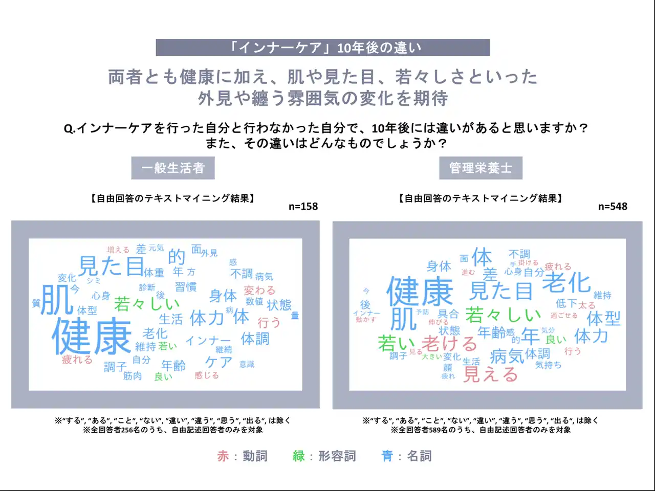 さらに、「インナーケアを行った自分と、行わなかった自分で10年後に違いがあると思いますか? また、その違いはどんなものでしょうか?」という設問へは、「健康」に加えて、「肌」「見た目」「若々しさ」という言葉が両者共通で多く挙げられました。 |