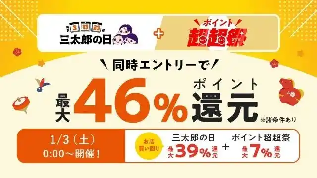 年始の初売りからバレンタイン準備まで、季節のイベントに合わせた超目玉商品や福袋、最安値挑戦商品などのおトクな目玉商品や、割引クーポン、ポイント還元などの特典を提供します。複数店舗の買い回りでポイント還元する「お買い物ラリー」特典とあわせて最大39%のポイント還元となり、さらに2026年1月3日は「ポイント超超祭」と同時エントリーいただくことで、最大46%のポイントを還元します。 |