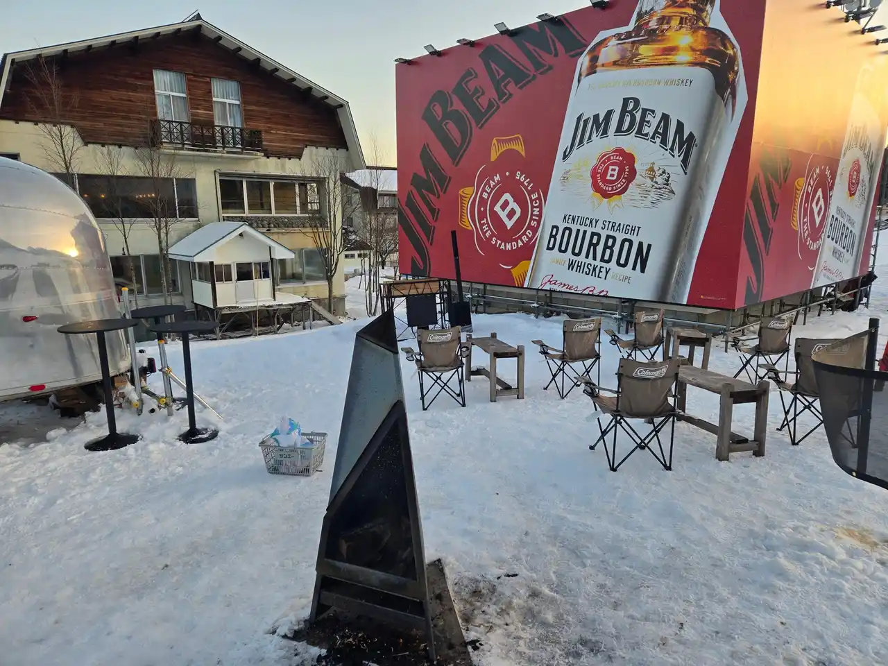 キッチンカーだけでなく、レストラン「スノードロップ」に専用カウンターが登場するほか、旧チケットセンター壁面などにも巨大なジムビーム看板を設置し、スキー場全体を盛り上げます。 |