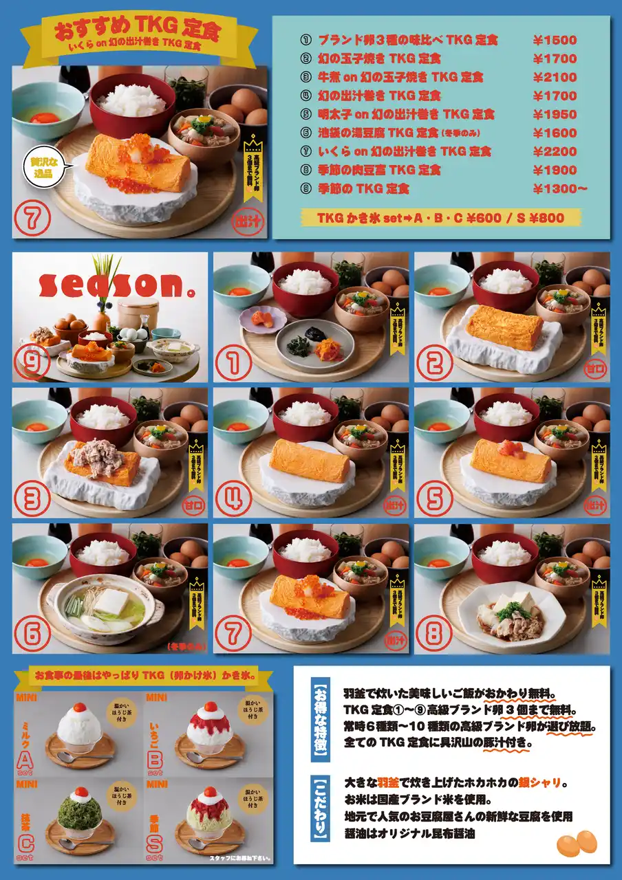 | 贅沢なTKG定食とこだわりのかき氷を同時に楽しめる、他にはない魅力あふれるグルメスポットです。 | ||||||||||||||||||||||||||
