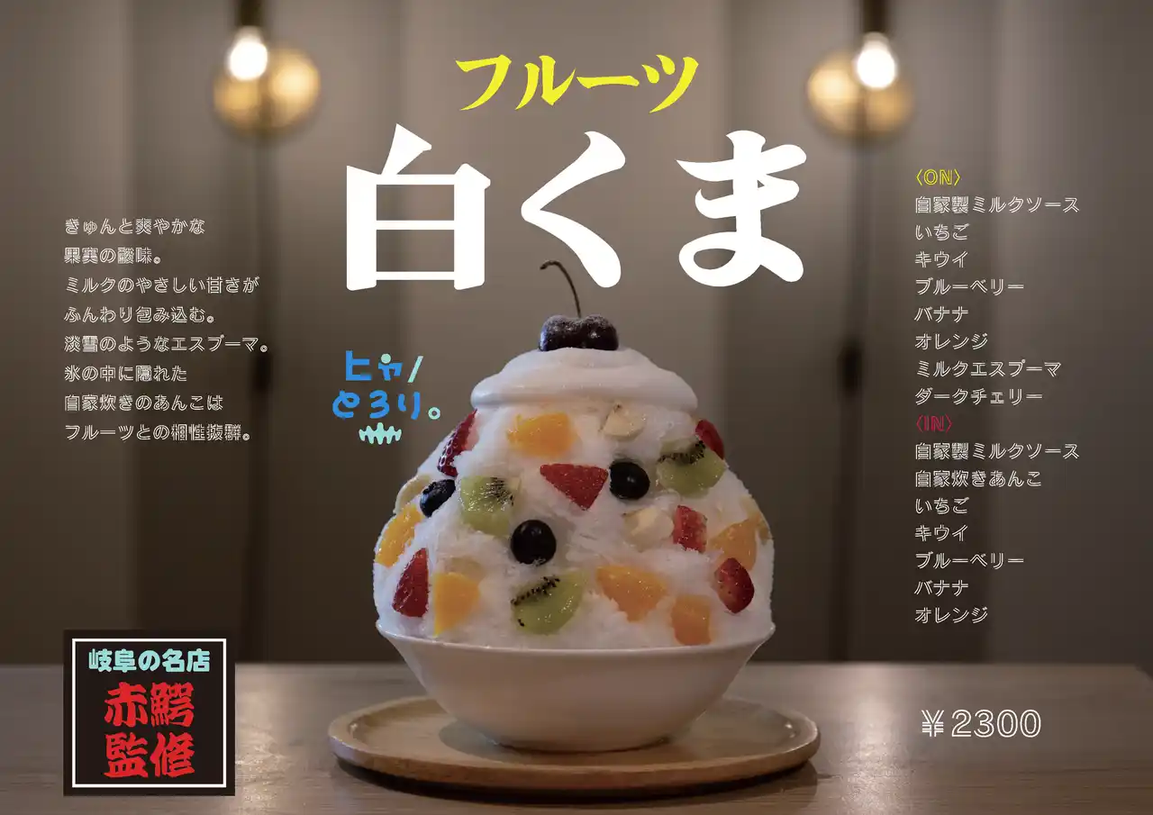 | 白×彩り。冬に味わう、どこか懐かしい一杯 「フルーツ白くま氷」ふわふわのミルク氷に、色とりどりのフルーツ、自家炊きの小豆、そして「ヒャ/とろり。」自慢の自家製ミルクソースをたっぷりとかけた冬限定のかき氷『フルーツ白くま氷』。 | ||||||||||||||||||||||||||