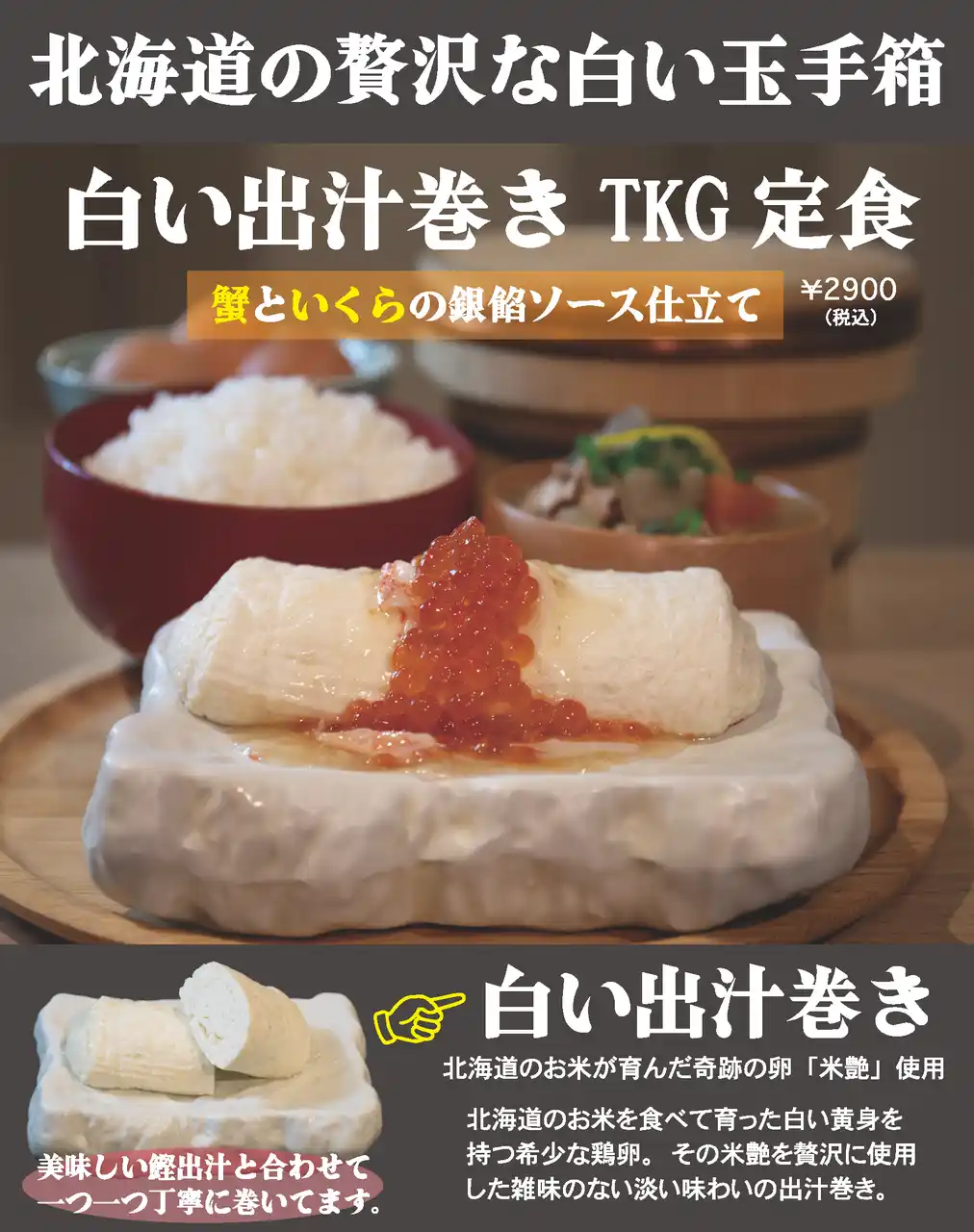 | 冬の新商品として登場するのが、『白い出汁巻きTKG定食 蟹といくらの銀餡ソース仕立て』。 | ||||||||||||||||||||||||||