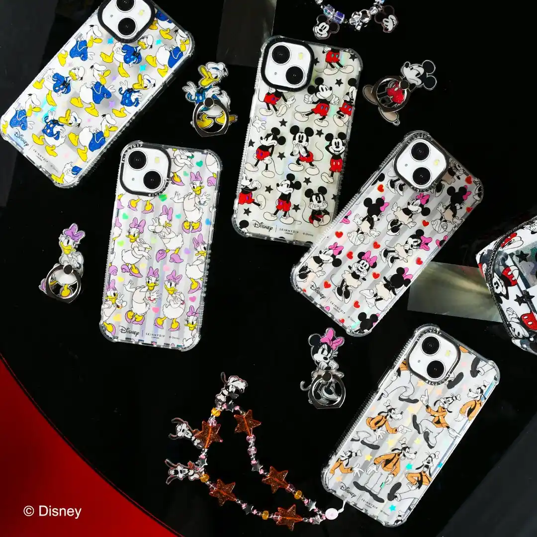 それぞれの作品世界を、SKINNYDIPならではのグリッターやホログラム加工、ステッカーチックな表現で落とし込み、日常に取り入れやすいモバイルアクセサリーとして展開します。 |