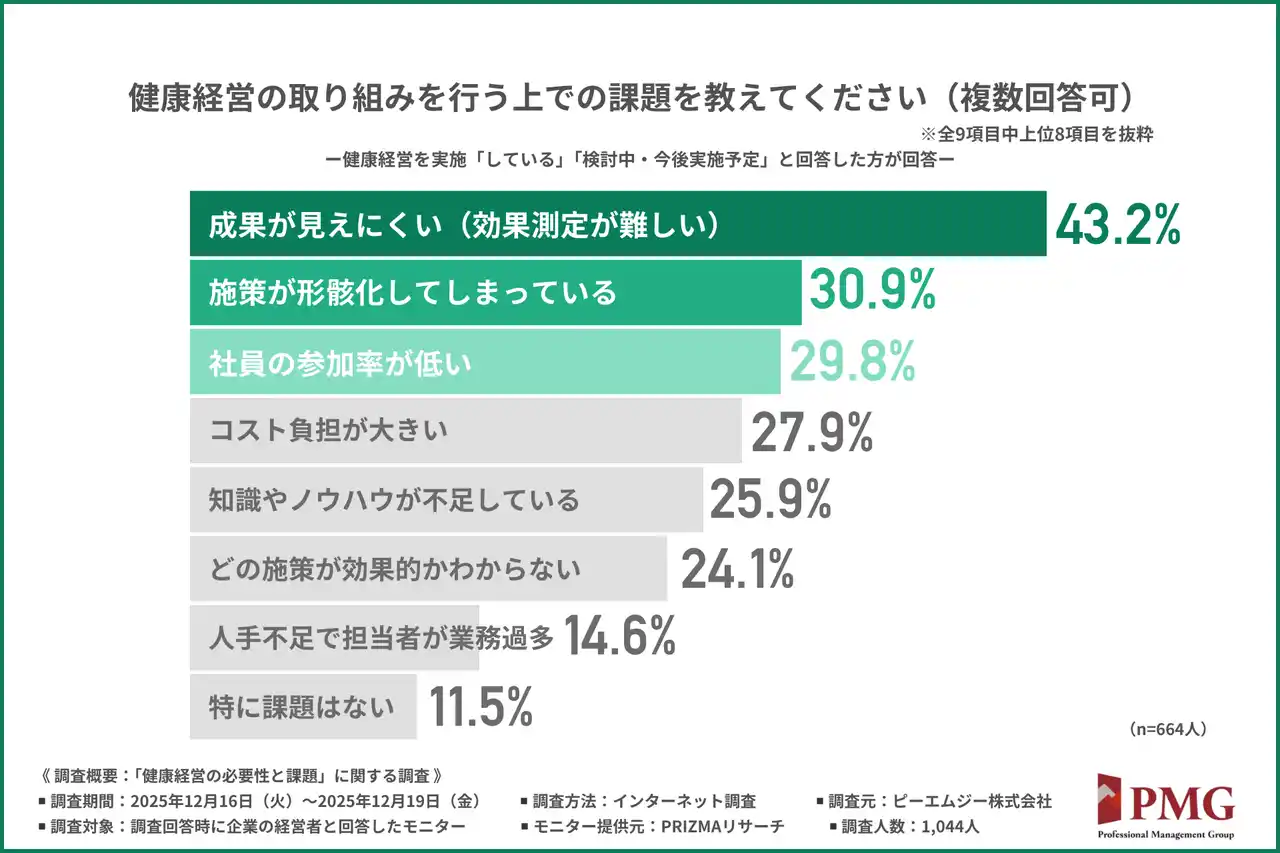 「健康経営を進める上での課題」を尋ねたところ、『成果が見えにくい(効果測定が難しい)(43.2%)』が最も多く、『施策が形骸化してしまっている(30.9%)』『社員の参加率が低い(29.8%)』と続きました。 |