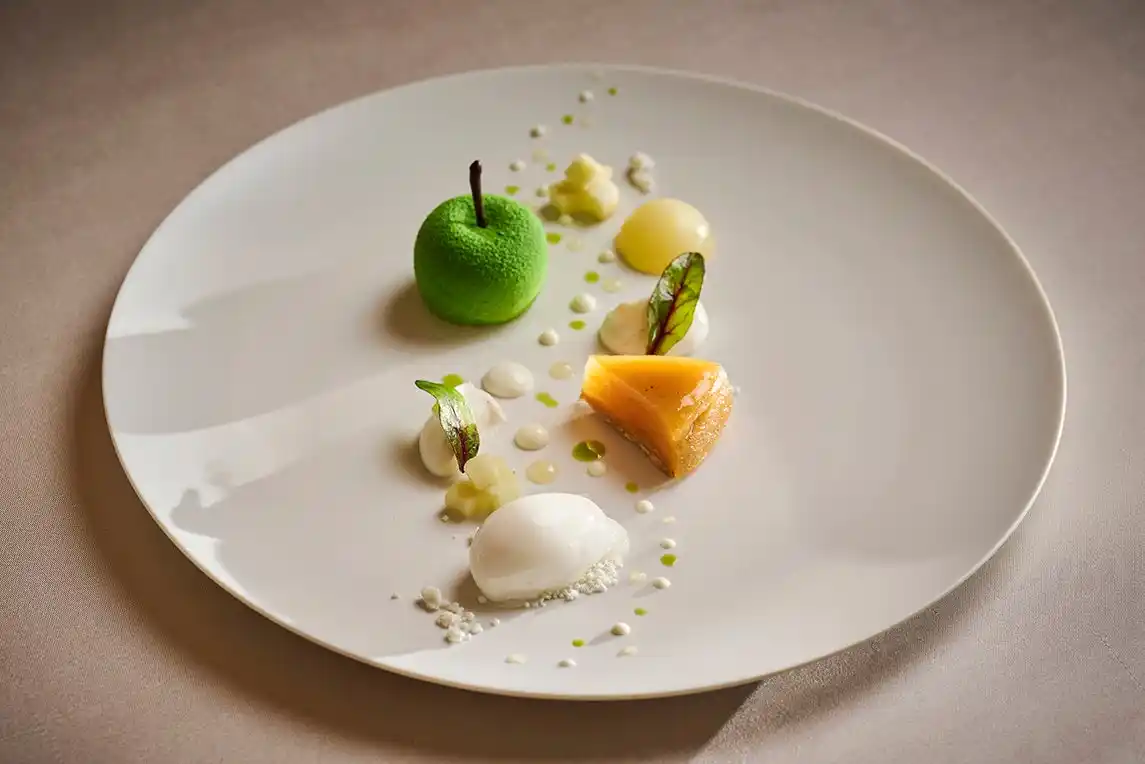 ディナーの幕開けは、フランス料理によるアミューズから。続いて、イタリア料理の前菜、フランス料理の前菜へと、ふたつの世界を行き交うような構成でおたのしみいただきます。コース終盤には、開業当時から総料理長の柳原と共に地元の生産者のもとを訪れてきたシェフパティシエ・石山 直人(いしやま なおと)によるデザートが登場します。フランス料理とイタリア料理、ふたつのエッセンスを取り入れたデザートが、美しい余韻とともにコースを締めくくります。 |