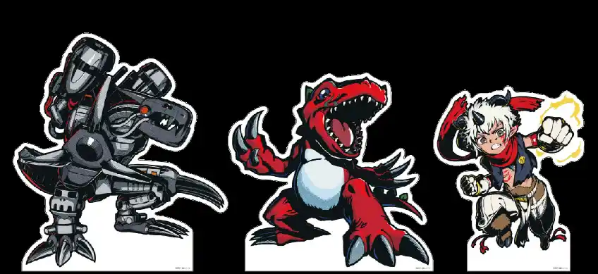 有史以前の世界に存在した古代の恐竜のようなデジモン。発達した2本の腕と巨大な尾で全ての物をなぎ倒す。知性もあり、おとなしい性格のため、とても手なづけやすい。そのため、初級テイマーからは重宝がられ、だいじに育てられることが多い。もっとも基本的なデジモンの代表的存在と言えるだろう。必殺技は身体の色と同じ、深紅の炎を吐き出す『ファイアーブレス』。 |