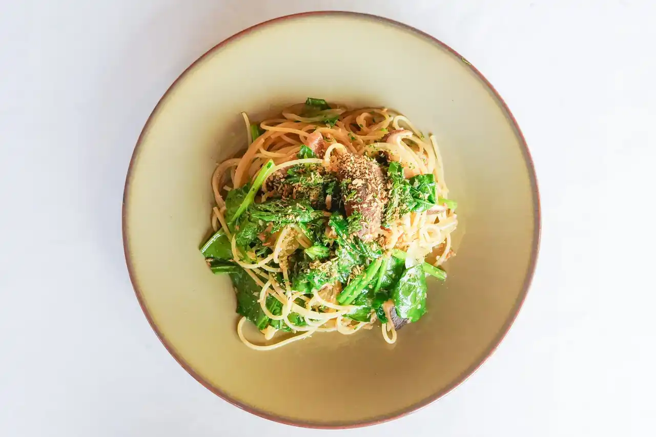 アンチョビとにんにくをしっかり効かせ、栄養たっぷりの無農薬ほうれん草と山口県美祢市産の原木椎茸を楽しむシンプルなペペロンチーノ。 |