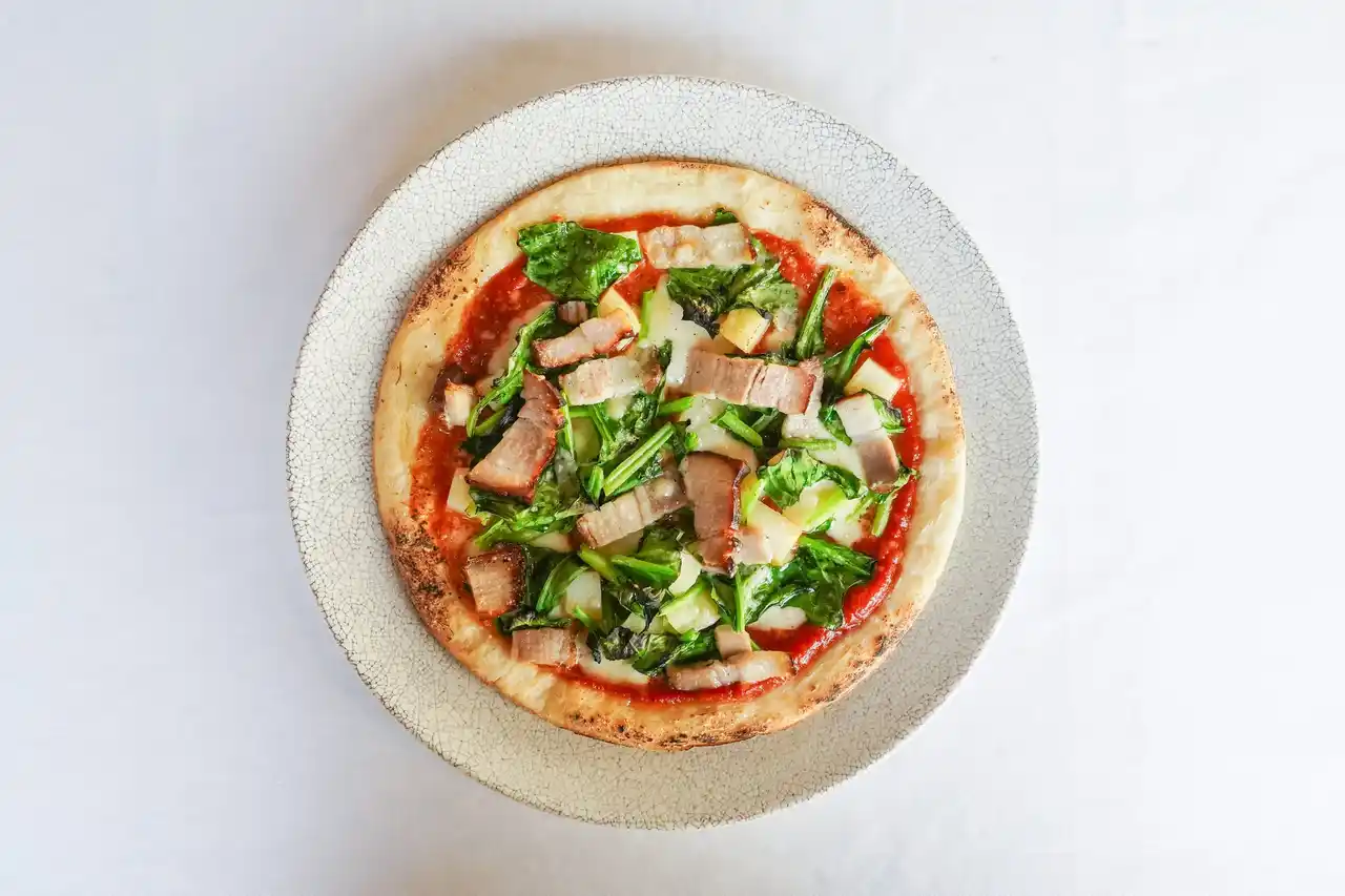 自家製ベーコンとほうれん草とじゃが芋のピザ |