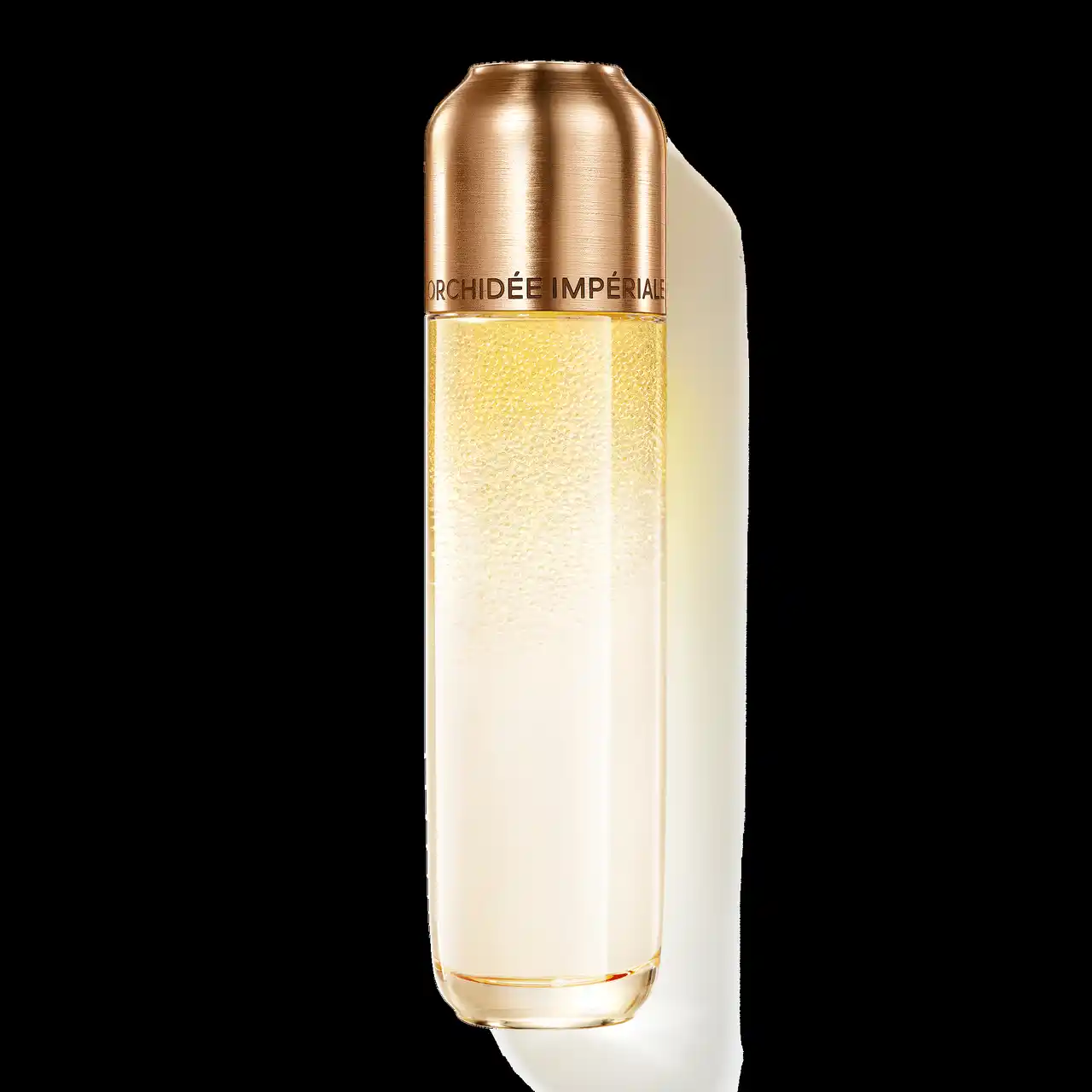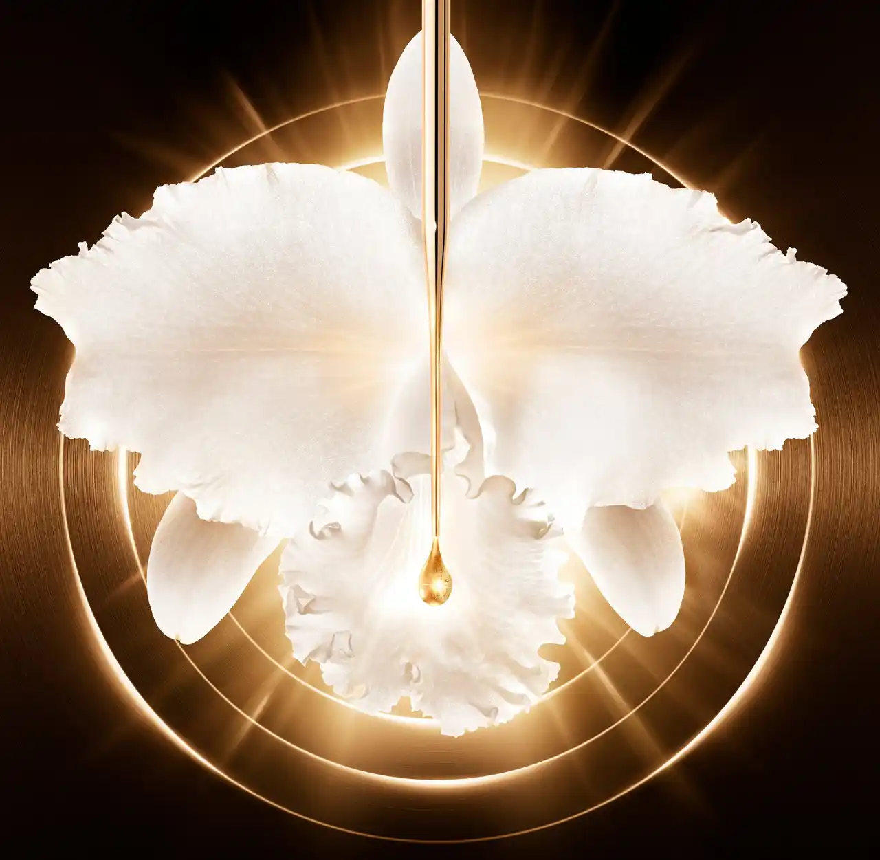 〈オーキデ アンぺリアル ゴールドノビレ ザ ゴールデッセンス ローション〉は、ゲラン独自のフォーミュラを採用しています。それは、オーキッド オレオ コンセントレート¹を閉じ込めた無数のゴールデン マイクロカプセルが、軽やかでシルキーなテクスチャーの中で分散したものです。 |