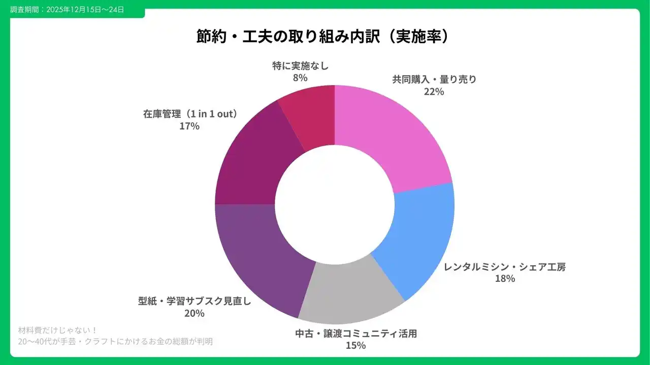 支出を抑える工夫として多かったのは、共同購入や量り売りの活用(実施率22%)、レンタルミシン・シェア工房の利用(18%)でした。特に「1 in 1 out」の在庫管理ルールを導入した層では、年間支出が平均18%削減されています。 |