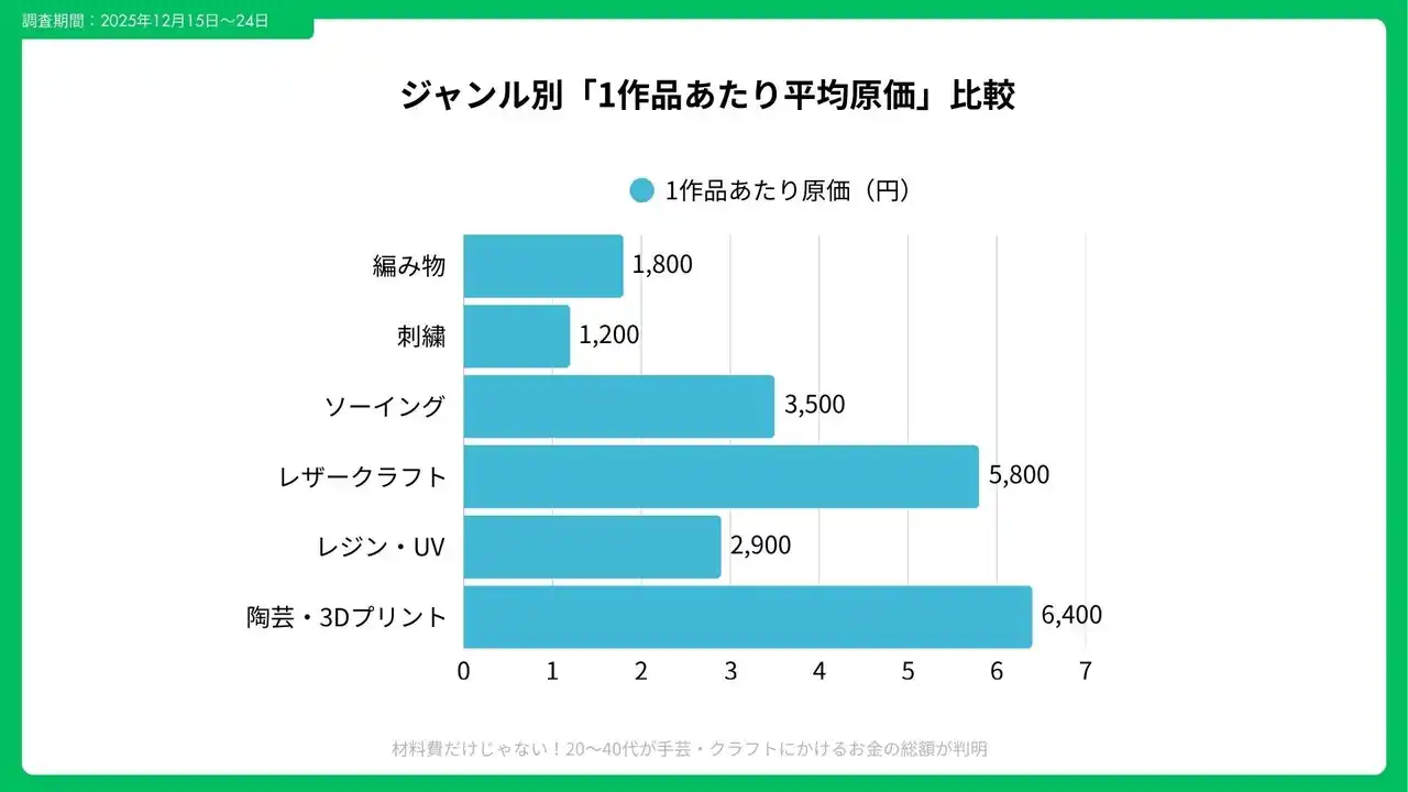 ジャンル別に見ると、初期費用と更新周期に大きな違いが見られました。編み物・刺繍は初期費用が比較的低く平均¥18,000ですが、材料の買い足し頻度は月1.6回。一方、レザークラフトやミシンソーイングは初期費用が¥60,000~¥120,000と高めで、工具更新は2~3年周期でした。 |