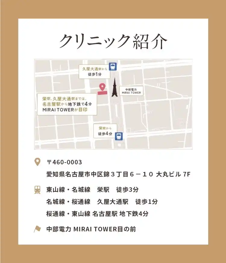 また、Core Clinicは栄・久屋大通エリアからアクセスしやすい立地にあり、安心して通い続けられる環境づくりを大切にしています。 |
