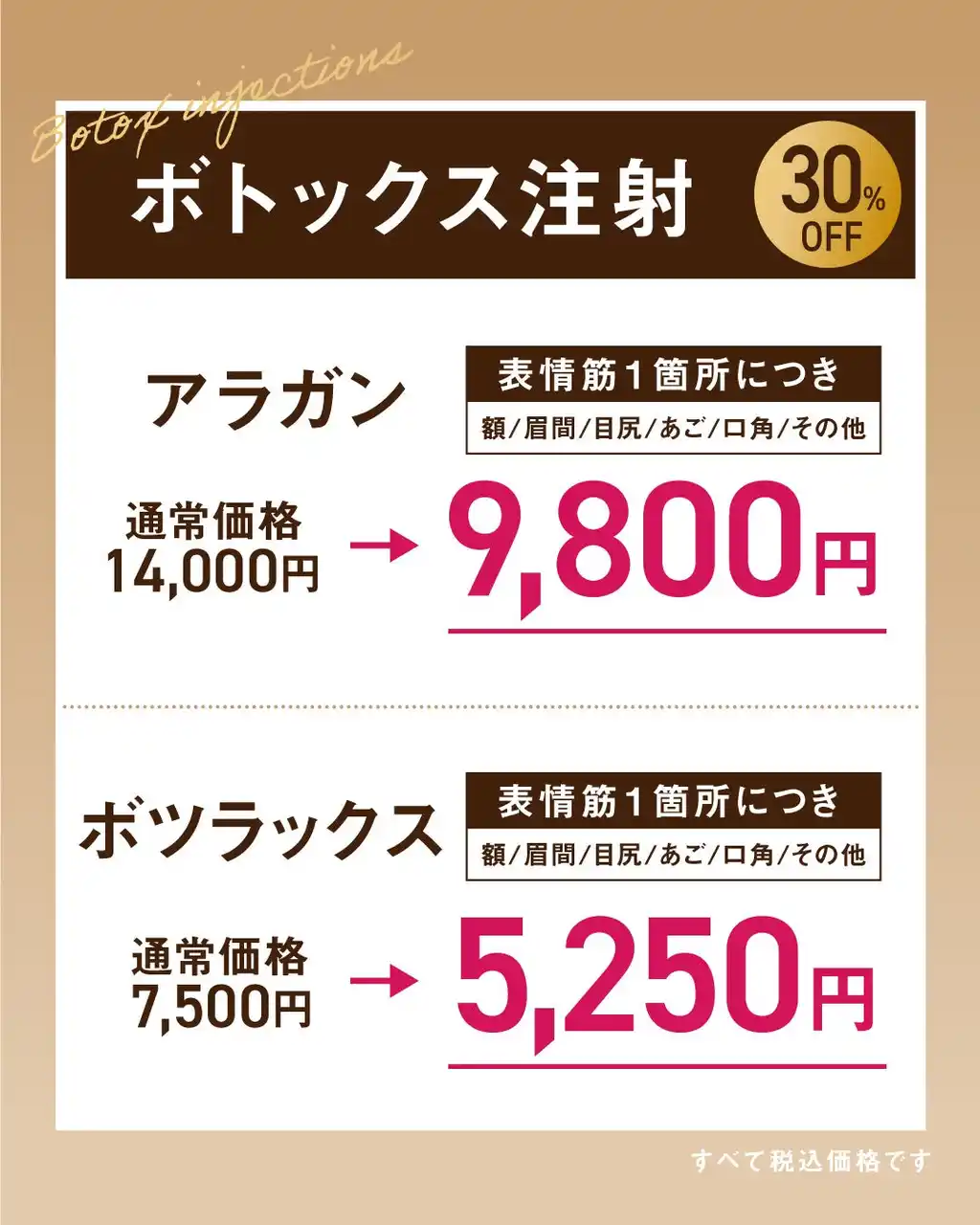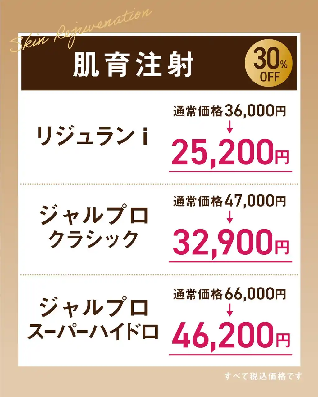 上記すべての注射施術が、通常価格より30%OFFで受けられます。 また、モニターでの施術をご希望の場合は、モニター価格からさらに30%OFFが適用されます。 |