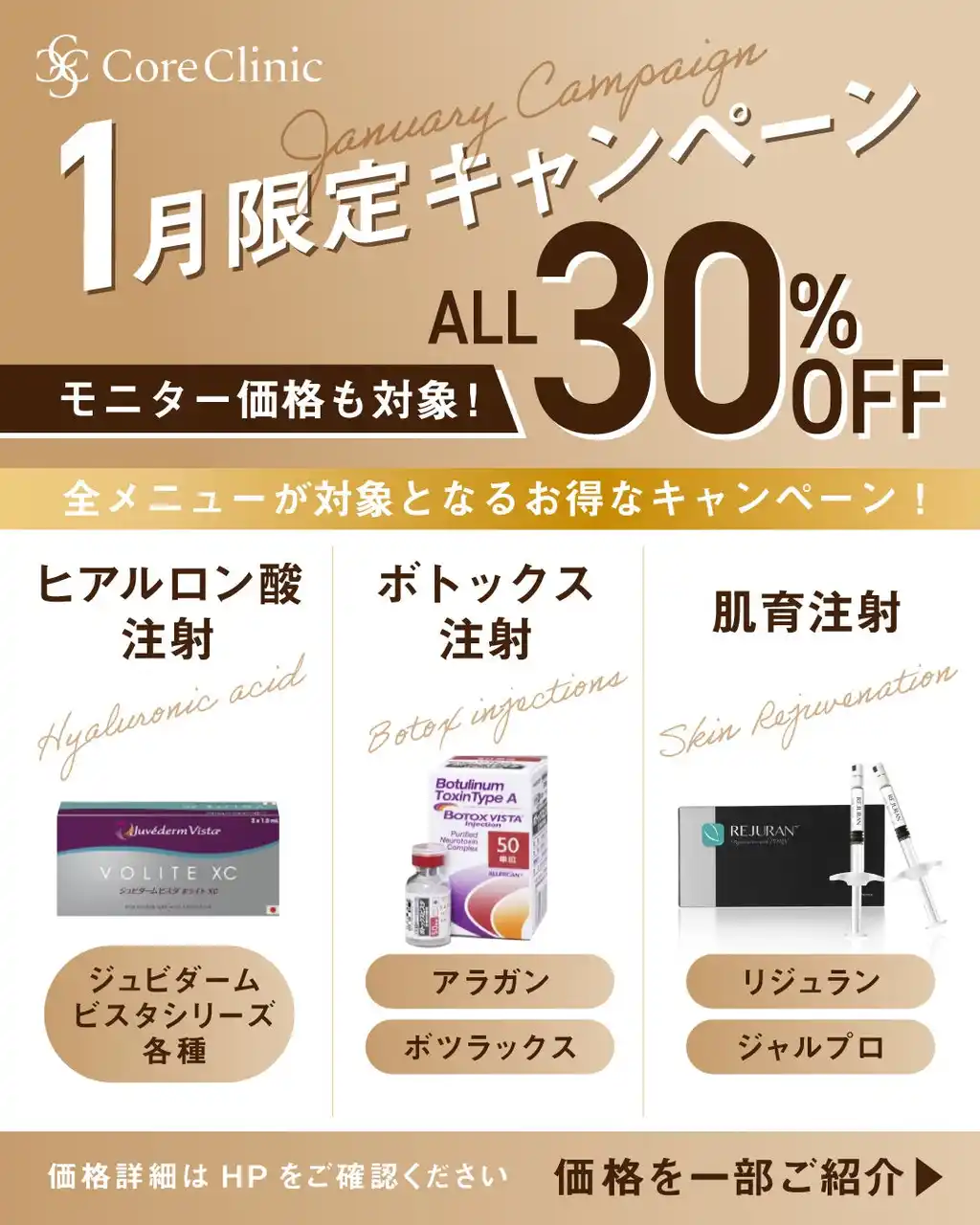 名古屋・栄エリアに位置する美容外科・美容皮膚科「Core Clinic(コアクリニック)」では、2026年1月限定で、ヒアルロン酸、ボトックス、肌育注射(リジュラン・ジャルプロ)を対象とした全注射施術30%OFFキャンペーンを実施いたします。 |