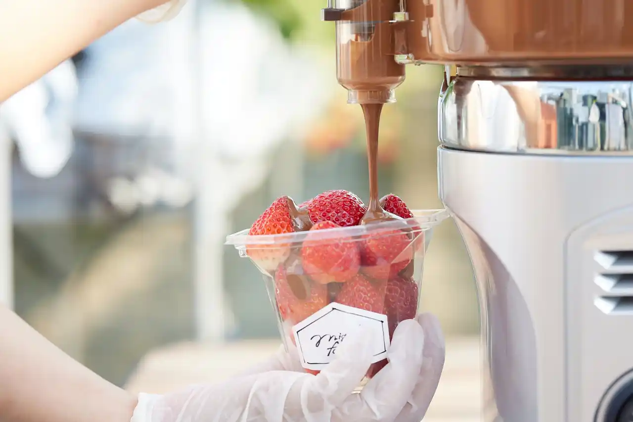 プレミアムプランはチョコレートソースや10種類以上の豊富なトッピングが何度でも利用可能です。摘んだいちごをカップに盛り、濃厚なチョコレートソースをスタッフが注ぎ込みます。そのあとは自分好みのトッピングが楽しめます。カラフルシュガーやマシュマロに加え、新しいトッピングが仲間入り。 |