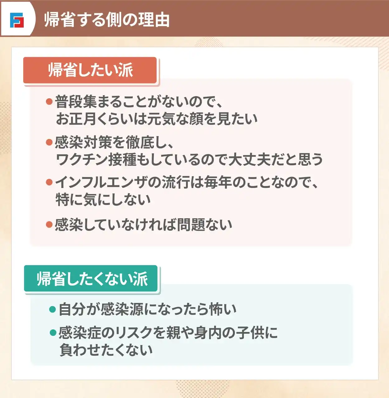 インフルエンザは特に高齢者や基礎疾患を持つ方で重症化しやすいことが知られており、今年の帰省は「重症化リスクの高い家族がいることを前提に検討されているケースが多い」と言えます。 |