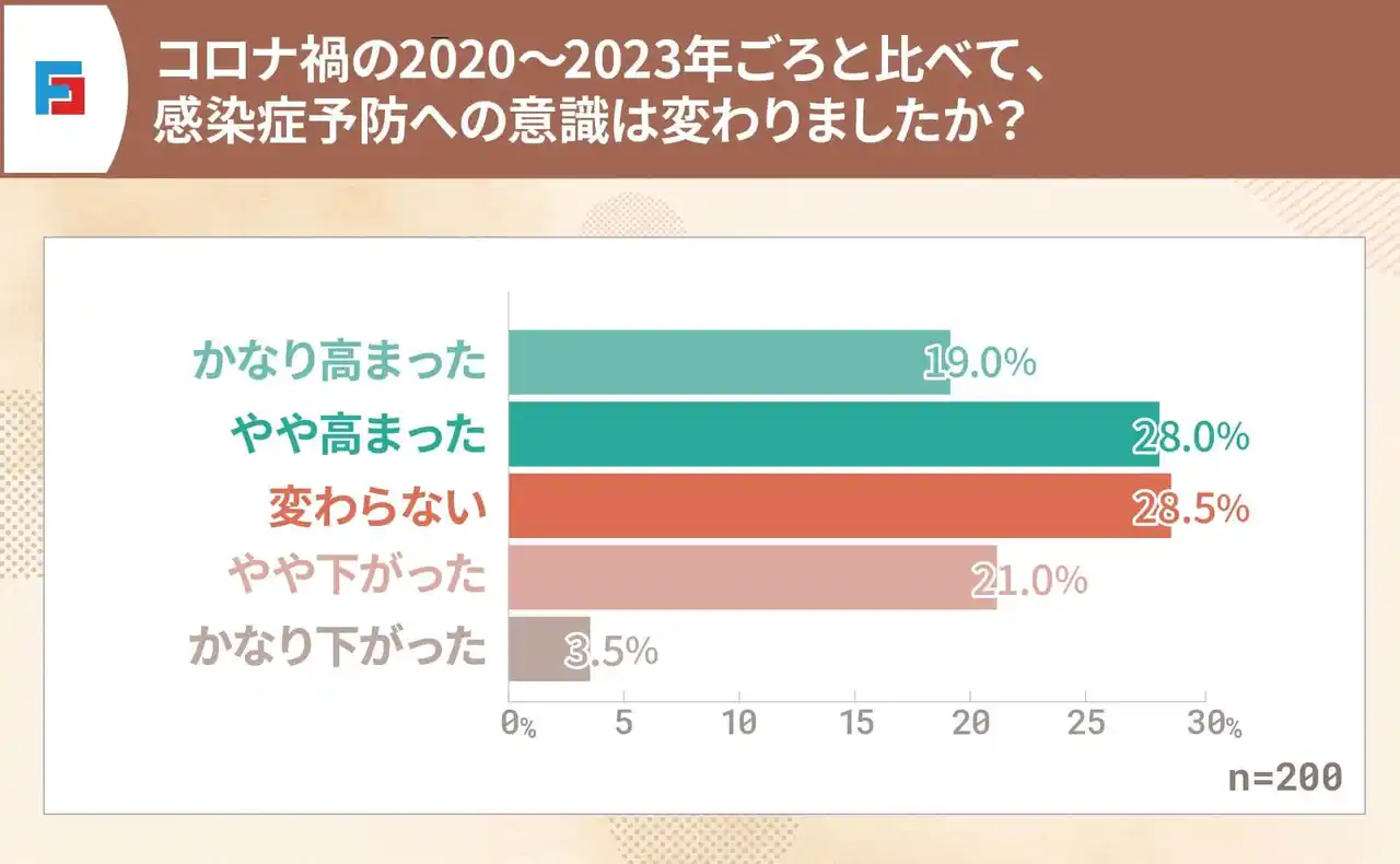 コロナ禍の2020~2023年ごろと比べて、感染症予防への意識がどう変わったかについては、「かなり高まった(19.0%)」「やや高まった(28.0%)」を合わせて47.0%が「意識が高まった」と回答しました。 |