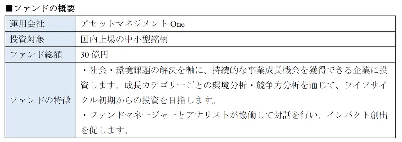 株式会社かんぽ生命保険(東京都千代田区、取締役兼代表執行役社長 谷垣 邦夫、以下「かんぽ生命」)とアセットマネジメントOne株式会社(東京都千代田区、取締役社長 杉原 規之、以下「アセットマネジメントOne」)は国内上場企業の中小型株を投資対象とした「AMOne国内中小型株式インパクト戦略ファンド(以下「本ファンド」)」を組成し、運用を開始しました。 |