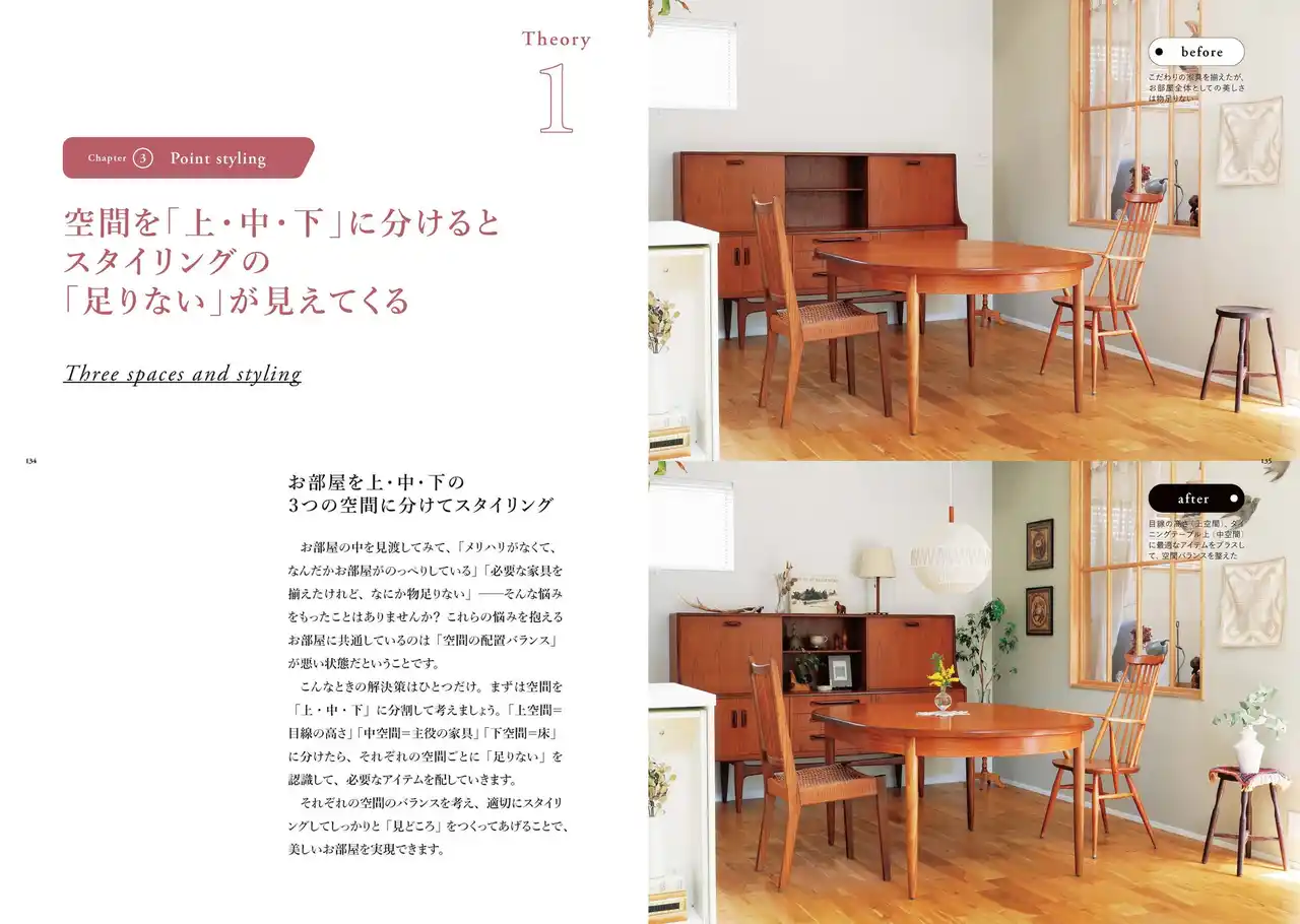 | 今回の新刊は、前著で培った考え方の軸はそのままに、内容を大きくアップデート。特定のテイストに限定せず、モダン・北欧・ヴィンテージなど、幅広いスタイルに応用できる“普遍的なインテリアセオリー”へと発展させました。 | |||||||||