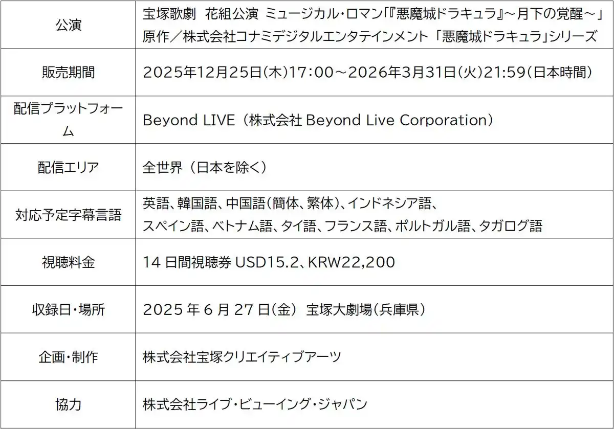 | 株式会社宝塚クリエイティブアーツ(兵庫県宝塚市)はこのたび、宝塚歌劇 花組公演 ミュージカル・ロマン『悪魔城ドラキュラ』~月下の覚醒~(原作/株式会社コナミデジタルエンタテインメント「悪魔城ドラキュラ」シリーズ ※2025年6月27日 宝塚大劇場(兵庫県)にて収録)を、世界180以上の国・地域へ動画配信(VOD)いたします。 | |||
