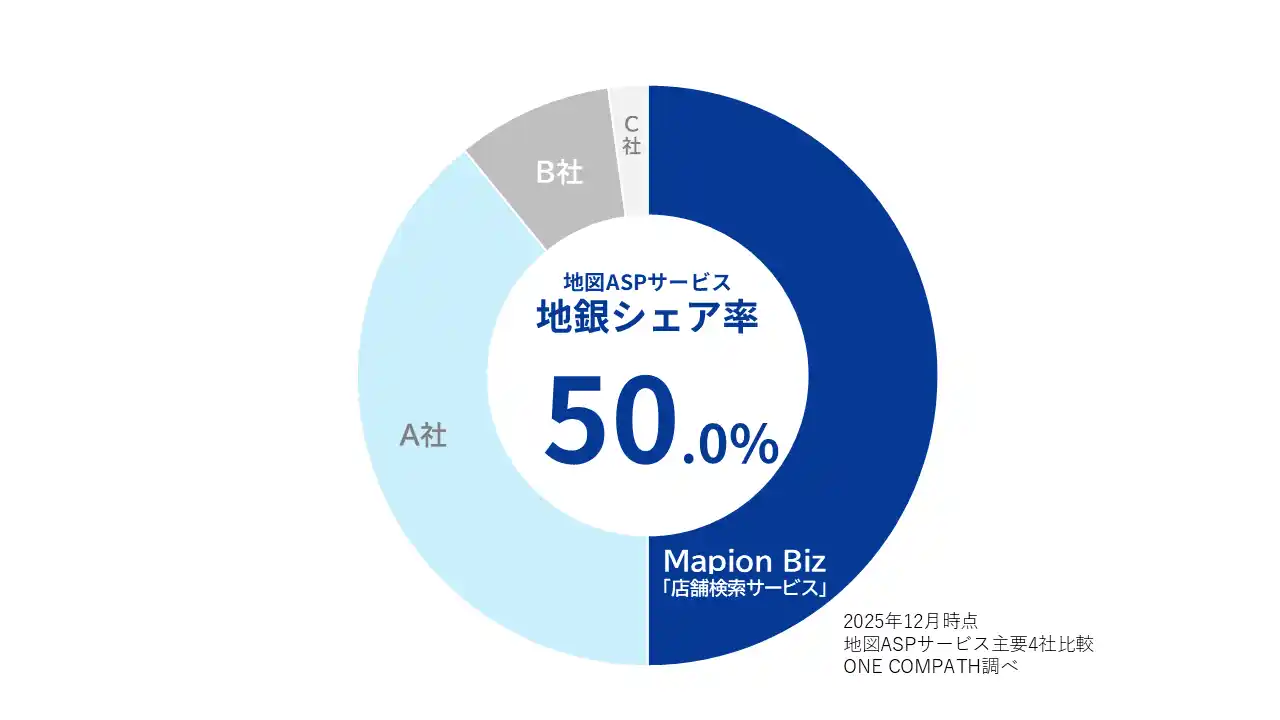 TOPPANグループの株式会社ONE COMPATH(ワン・コンパス 本社:東京都港区、代表取締役社長CEO:早川 礼)が運営する法人向けの地図ソリューション「Mapion Biz(マピオン ビズ)」は、2025年12月に行った独自調査によると、地図ASPサービスを導入する地方銀行の中で、企業のサイトで店舗を検索できる「店舗検索サービス」のシェア率が50.0%となりました。近年では、各金融機関のニーズに応じた多様なカスタマイズが評価され、地方銀行を中心に導入・リニューアルが相次いでいます。 |