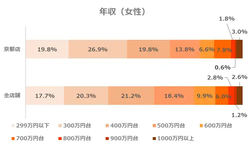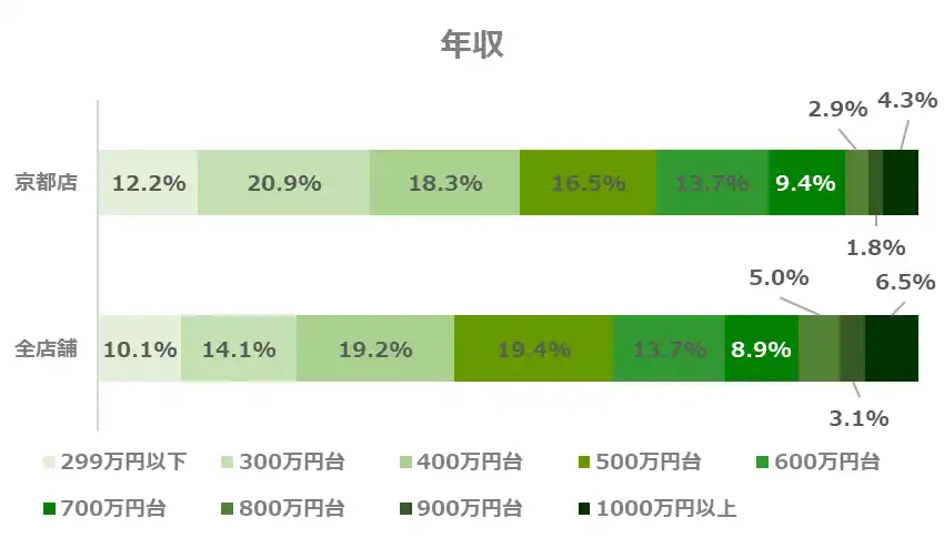 京都店では、年収300万円台が最も多く、次いで400万円台、500万円台と続いています。 |
