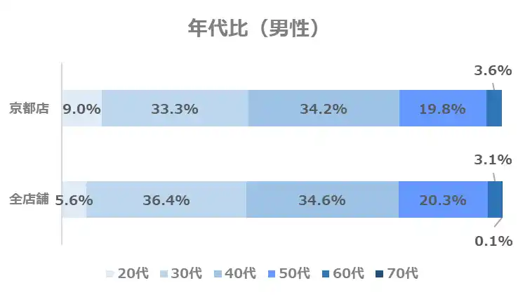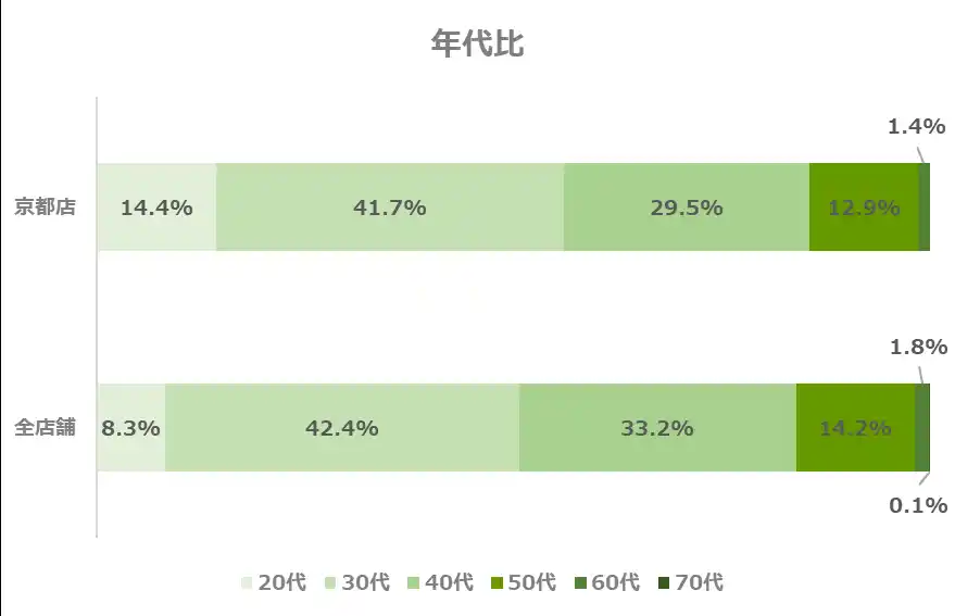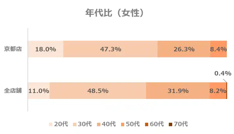 京都店の年代別構成比は、20代の割合が全店舗と比べると高く、早い段階で結婚相談所での婚活を始める人が多いようです。 |