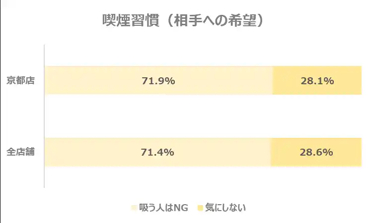 お相手に求める喫煙の習慣についてのデータを見てみると、全店舗とほぼ同じ結果となりました。 |