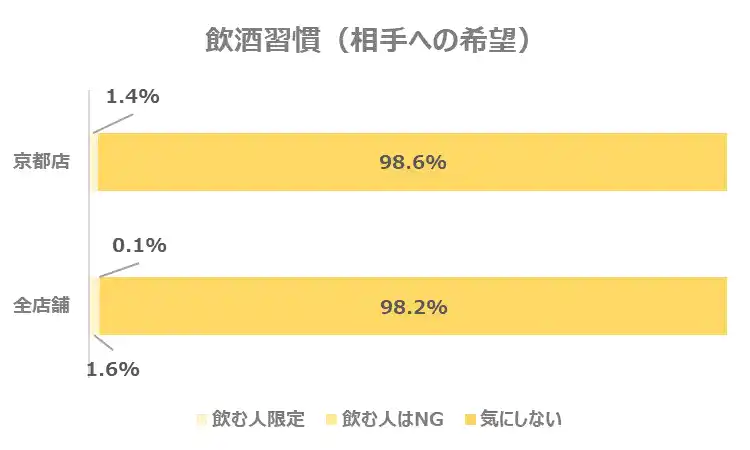 お相手に求める飲酒の習慣についてのデータを見てみると、全店舗とほぼ同様の結果となりました。 |